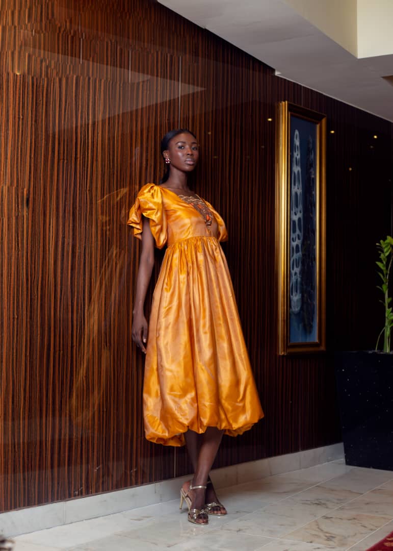 A silk bobby gown designed by Katieo eleganza. It can be worn to dinners, weddings and other event.