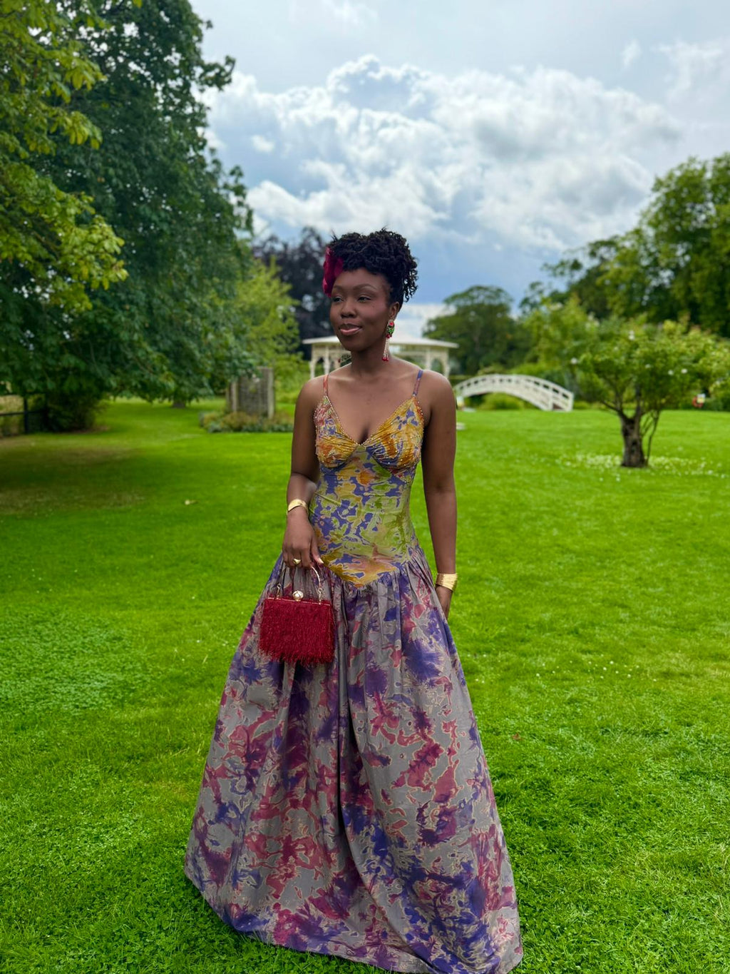 Primary Fabric & Texture: The dress is made from a rich batik-style fabric, known for its vivid coloration and marbled textures. The base tones include deep burnt orange, amber, and yellow, wit...