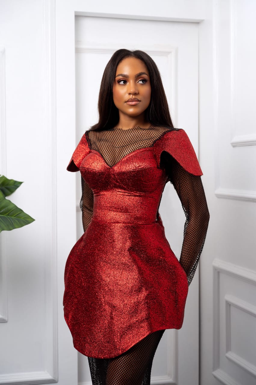 This bold red metallic mini dress features a structured sweetheart bodice with dramatic shoulder panels and a sculpted tulip-shaped skirt. A black fishnet mesh overlay adds contrast and...